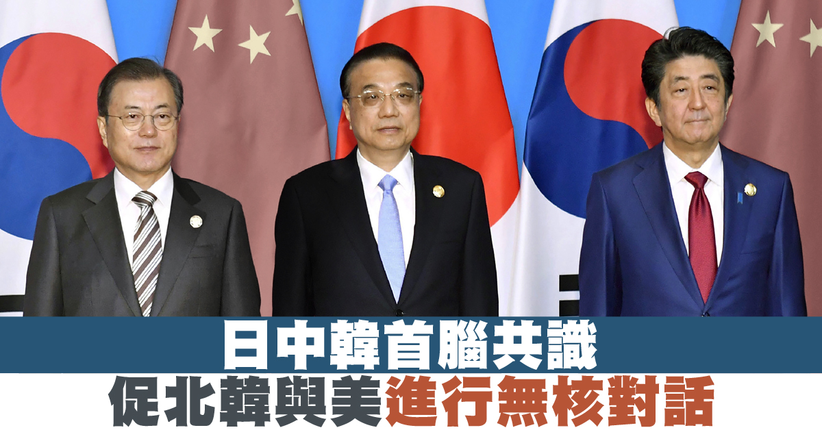 【新唐人亞太台 2019 年 12 月 24 日訊】來關心,今天,日本、中國、韓國,三國首腦在四川成都舉行會談,除了經濟之外,其中一個重要議題就是北韓的核武危機。今天,三國一致同意,要共同努力,促進北韓與美國,就北韓去核化,進行對話。