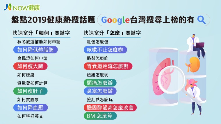 Google日前公布2019年熱搜話題,健康相關包括,「如何」類:第2名如何降低體脂肪;第4名如何瘦大腿;第7名如何瘦肚子;第9名如何降血壓。