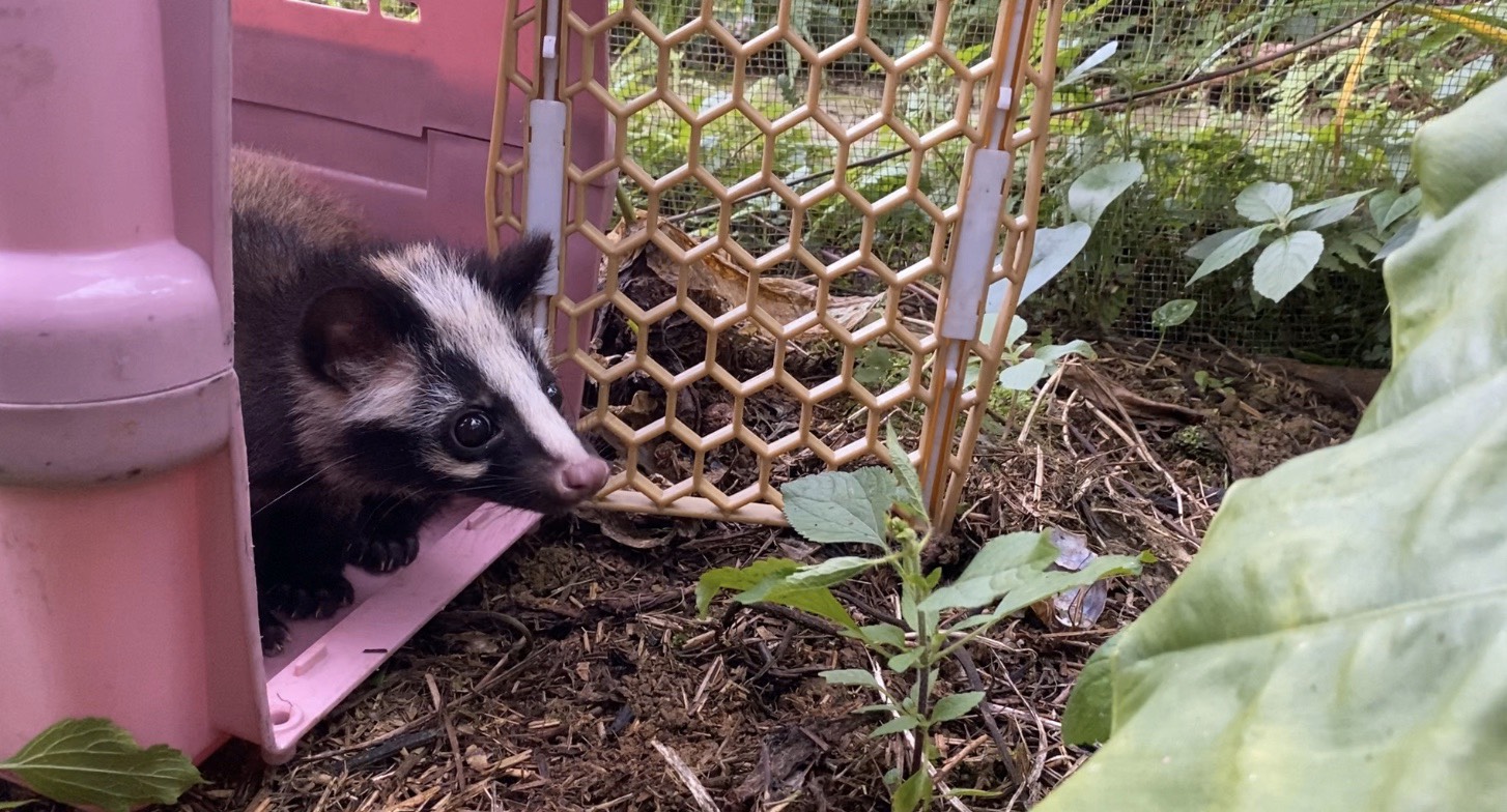 石碇區小格頭野鳥中途之家,提供了救傷後漸進式野放訓練及收容照顧,對白鼻心來說是個完全陌生的世界,動保員可是等了30分鐘,才願意踏出第一步離開外出籠,時聞一聞地上的泥土,有時咬一咬幼嫩的新芽,慢慢適應這新的環境;未來動保處將評估牠們自行覓食狀況及對野外適應的能力,於完全適應後逕行野放。