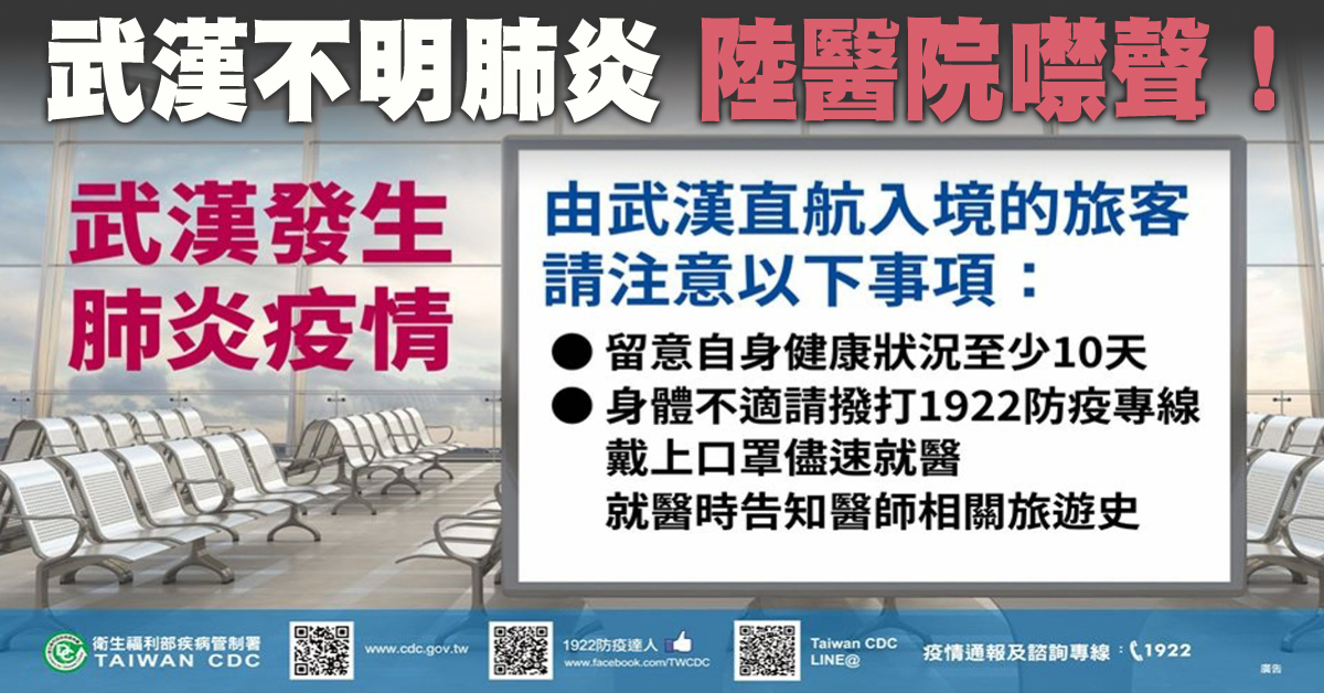 【新唐人亞太台 2020 年 01 月 01 日訊】再來看到,中國武漢爆出不明原因肺炎疫情,網傳疑似醫院內部群組稱已經確診為SARS病毒,但中共官方並沒有證實,對此,台灣疾管署昨晚召開記者會,署長周志浩說,為求慎重,自即日起,將針對自中國武漢直航入境的班機,約每週12班,進行登機檢疫,防疫人員會登機,除了主動評估旅客健康情形外,也會在班機上向旅客宣導相關預防措施,提醒旅客,10天內如果有身體不適,應通報1922防疫專線,協助就醫。登機檢疫的施行期限,視中國疫情發展而定。