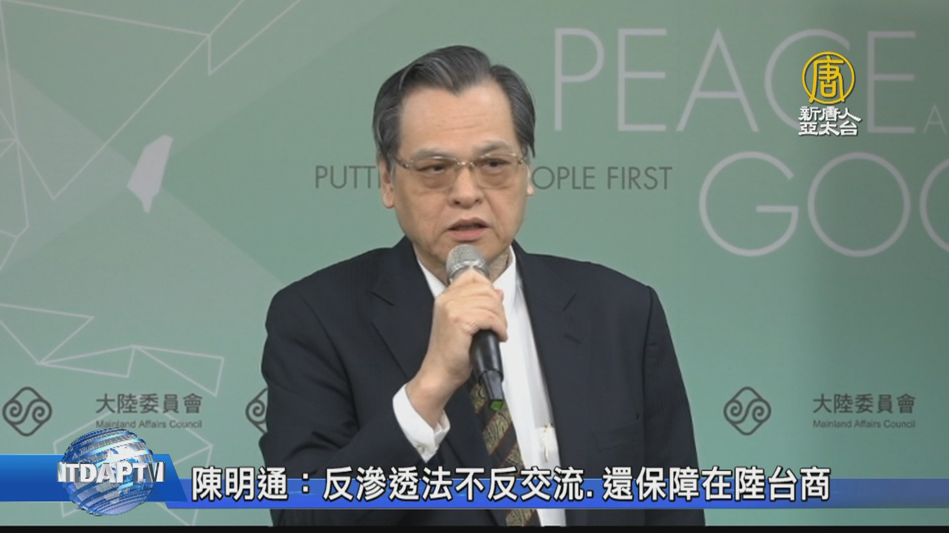 【新唐人亞太台 2020 年 01 月 02 日訊】陸委會主委陳明通今天(2日)主持例行記者會,重申「反滲透法」內容嚴謹,只針對受境外敵對勢力指示、委託或資助,而違法捐贈政治獻金、助選、遊說等干擾選舉的不法行為;至於兩岸正常的從商、求學、宗教或表演藝術交流,都沒問題。對大陸台商,反而是一種保障。