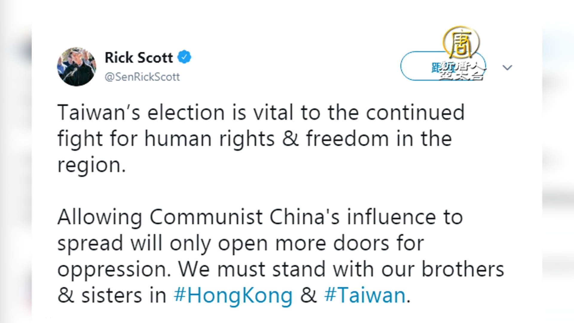 【新唐人亞太台 2020 年 01 月 07 日訊】台灣2020年大選僅剩4天,世界各國對於台灣大選的結果及兩岸關係變化都相當關注,美國聯邦參議員史考特今(7日)推文表示,台灣大選對於民主人權與自由至關重要,「我們必須與香港和台灣的兄弟姐妹站在一起」。