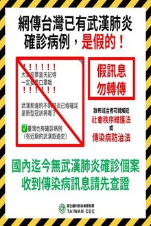 近日有網友於社群網站及軟體上散布內容提及「武漢那邊的不明肺炎已經確定是新型冠狀病毒了,臺灣也有確診病例……」之不實訊息,疾病管制署發布聲明嚴斥該言論屬不實訊息,臺灣目前並無確診病例,籲請民眾勿再轉傳、散佈。