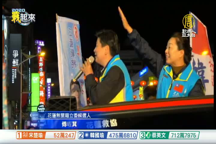 【新唐人亞太台 2020 年 01 月 11 日訊】花蓮縣立法委員選舉結果出爐,由無黨籍立委候選人傅?萁勝出,傅?萁目前得票數4萬3274票,確定超過民進黨立委候選人蕭美琴3萬7936票,7點20分傅?萁已經自行宣布當選。