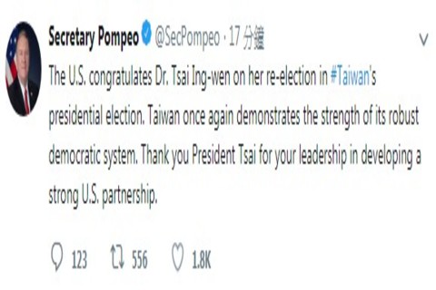 美國務卿蓬佩奧再推特祝樂蔡英文當選,蓬佩奧表示,美國恭賀蔡英文在台灣總統大選中當選連任,台灣再次展現強健民主制度的力量。