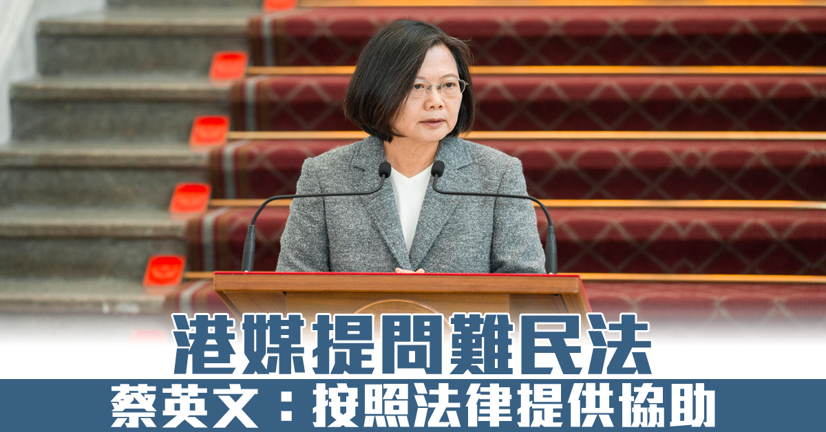 香港媒體VS. 中華民國總統 蔡英文:「(總統可以給香港記者一個機會嗎?想問一下陳同佳案件會有新的處理方法嗎?陳同佳案件,還有難民法會不會修改,接受香港的示威者過來,我們都很關心這個問題。)香港的市民要來台灣,我們已經有一定的法律來作為我們行為的準則。所以我們也會對有一些香港的市民,他們有政治上的必要的話,我們也會按照法律來提供協助。」