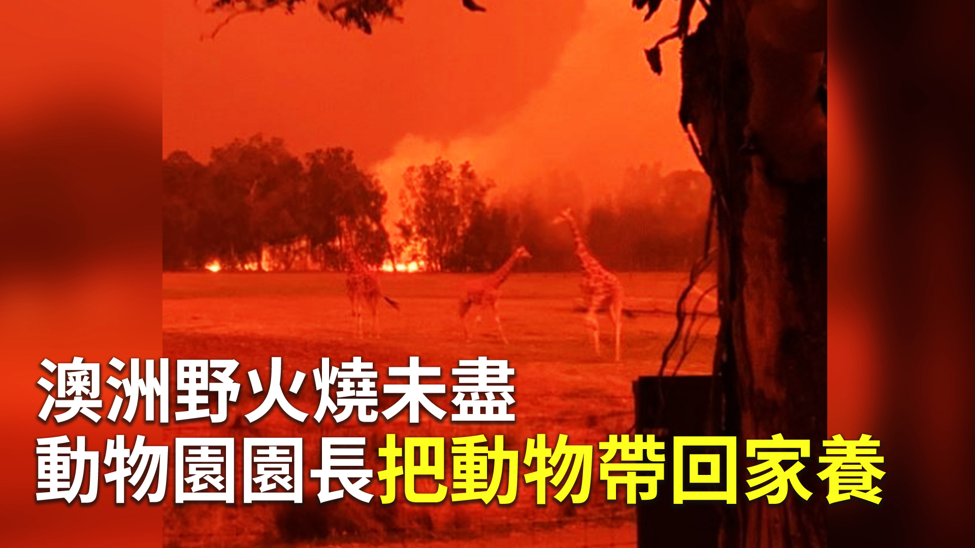【新唐人亞太台 2020 年 01 月 18 日訊】澳洲野火延燒了幾個月,不但迫使許多人撤離,也讓數不清的動物失去家園、甚至生命。有一座動物園的園長為了保護園內動物的安全,索性把體型較小的動物帶回家照顧。而帶不走的大型動物,也有相關人員留下來看守。