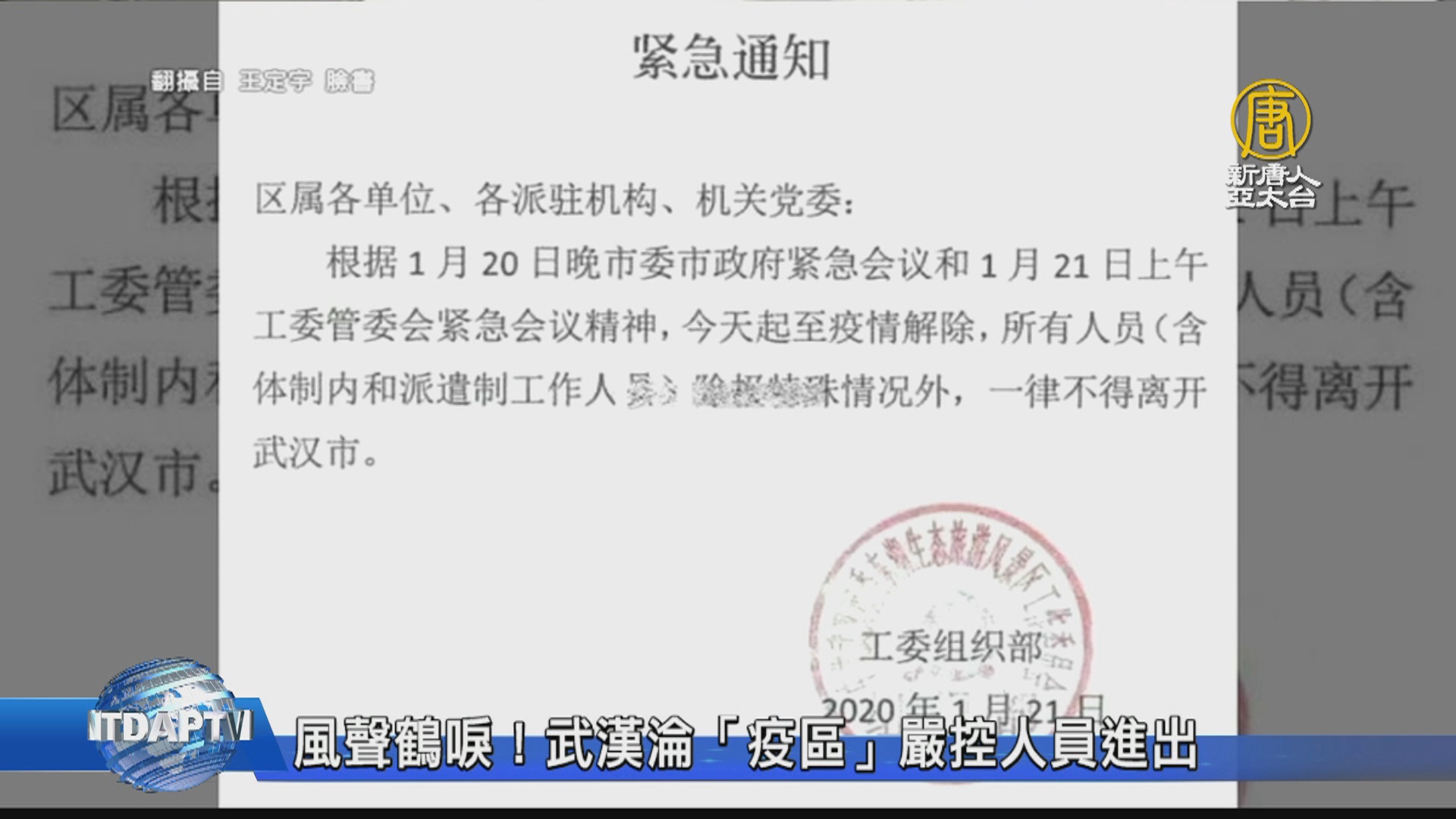 【新唐人亞太台 2020 年 01 月 21 日訊】武漢新型冠狀病毒疫情加劇,加上中國大陸正值春運潮,為了防範疫情持續擴散,據中共官媒人民日報報導,武漢市衛健委今天宣布,實施進出人員管控,包括旅遊團隊不組團外出,汽車抽檢後車箱是否攜帶活禽、野生動物等。而立委王定宇也在臉書分享一則中共武漢工委組織部的緊急通知,要求所有在武漢的人員,即日起到疫情解除前,都不得離開武漢!但詳細情況仍待核實。中共衛健委高級別專家組成員曾光 也呼籲,現在能不到武漢去就不去,武漢人能不出來就不出來,這不是官方的號召,是專家組的建議。