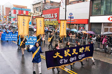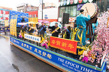 大紀元、新唐人媒體集團多語種的中西族裔員工約100人,手持「大紀元時報——良心媒體、權威感言、引領時代」、「海外最大中文電視新聞網」以及數十個金牌欄目的橫幅——包括「全球新聞」、「中國禁聞」、「世事關心」、「健康1+1」、「今日大紐約」、「傳奇時代」、「細語人生」、「笑談風雲」等,浩浩蕩蕩,一路不斷向民眾致以新年的問候。