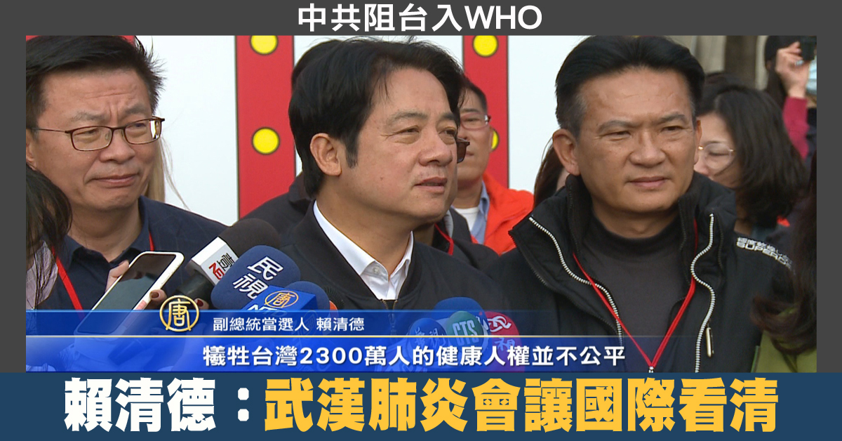 【新唐人亞太台 2020 年 01 月 29 日訊】因為中共阻撓,台灣無法參加世界衛生組織武漢肺炎疫情相關會議;台灣要包機撤僑,都受到中共干擾。對此,副總統當選人賴清德29日受訪表示,中共打擊台灣、忽略台灣民眾的健康權益,損人不利己,這次武漢肺炎疫情將讓國際社會看得更清楚,台灣不應被世界衛生組織排除在外。