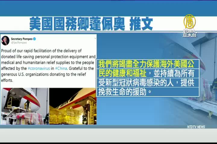 【新唐人亞太台 2020 年 02 月 05 日訊】武漢肺炎疫情,全球擴散,中共外交部日前高調譴責、聲稱美國「沒有提供任何實質性幫助」。不過,美國國務卿蓬佩奧及國務院發言人,分別發布推文證明,美國已經將救援物資,迅速發送到中國。而中方研究機構也統計,截至2月2日,已有188家外資企業,合計捐贈10.96億人民幣,其中又以美國企業,名列第一。