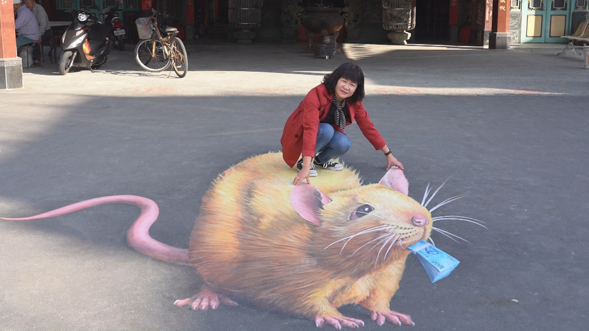 廟口大金鼠,嘴裡咬著10萬塊的千元大鈔,坐在特定位置拍照,就像坐在鼠背上,金光閃閃充滿喜氣,這隻3D大金鼠,被知名彩繪大師曾進成一PO文,馬上成為雲林鼠年最夯的3D彩繪動畫。