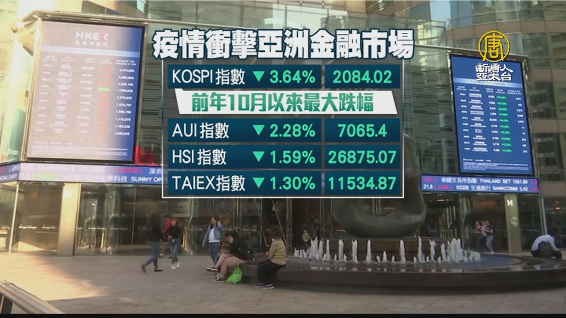 【新唐人亞太台 2020 年 02 月 25 日訊】武漢(中共)肺炎疫情蔓延全球,確診數不斷增加,引發市場擔憂,投資人大量拋售;亞洲主要金融市場,從南韓、澳洲、香港、到台灣股市,紛紛下探走低,24日美國股市也重挫,道瓊工業指數暴跌1031點,國際貨幣基金組織(IMF),下修中國大陸以及全球今年GDP預測。瑞銀董事長甚至警告,中國第1季可能因疫情而出現負成長。