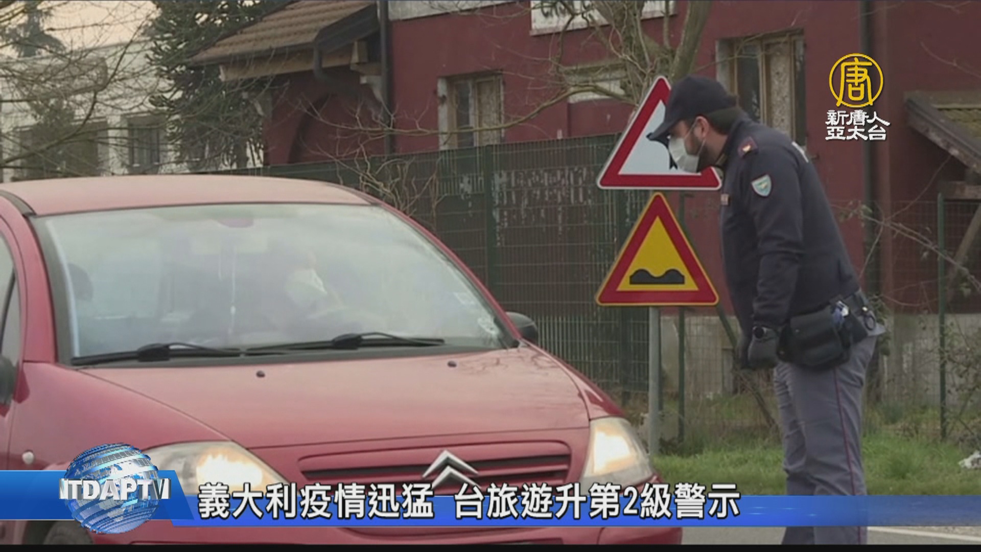 【新唐人亞太台 2020 年 02 月 25 日訊】好,因應義大利武漢(中共)肺炎確診人數快速擴張,來到229例、6人死亡,指揮中心今天宣布,將旅遊疫情建議升至第二級的「警示」,提醒民眾到當地要加強防護措施。