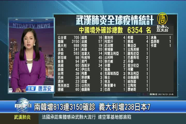 【新唐人亞太台 2020 年 02 月 29 日訊】帶您快速瀏覽全球中共肺炎的最新確診數據,南韓今天共新增813起確診,累計確診3150人,17人死亡。義大利新增238起確診達到888起,21死。日本新增7例,境內共確診241起5死。伊朗累積593例43死,今天還傳出有有國會議員不治身亡。另外,立陶宛、聖馬利諾、亞塞拜然、摩納哥、冰島、墨西哥、卡達也出現首起確診病例。目前中國大陸以外,已有59國發現中共肺炎病例。