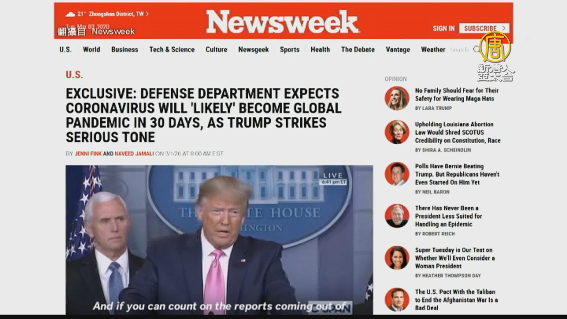 【新唐人亞太台 2020 年 03 月 04 日訊】午報頭條先來關心,3號,世界衛生組織表示,目前,在全球有3.4%的中共肺炎病患死亡,死亡率遠高於流感。而美國五角大廈也提出全球大流行的警告,美國正考慮擴大旅遊禁令。