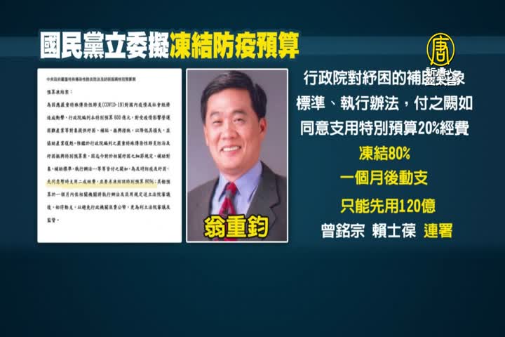 【新唐人亞太台 2020 年 03 月 09 日訊】600億的紓困預算在立法院審查,不過國民黨立委翁重鈞,提出凍結80%預算,也就是行政機關只能先用20%、120億,其餘480億,要一個月之後才能動支,這讓民進黨立委當場痛批翁重鈞,總統蔡英文也喊話,希望立委給點彈性,最後這個案子因為連署人數不足,不成案。下午確定,特別預算600億沒有任何刪減或凍結初審通過;預定在周五(13日)送立法院會三讀。