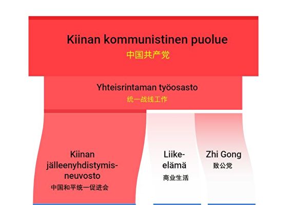 YLE的調查報告中清晰地繪製出被中共所控制的機構在海外利用不同社團及組織進行滲透的圖表,其中包括直接隸屬於中共的中央統一戰線工作部(簡稱統戰部),統戰部又直接操縱中共統促會、華商總會和致公黨。