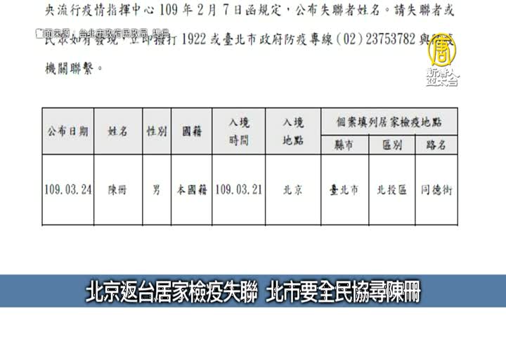 北京返台居家檢疫失聯 北市要全民協尋陳冊