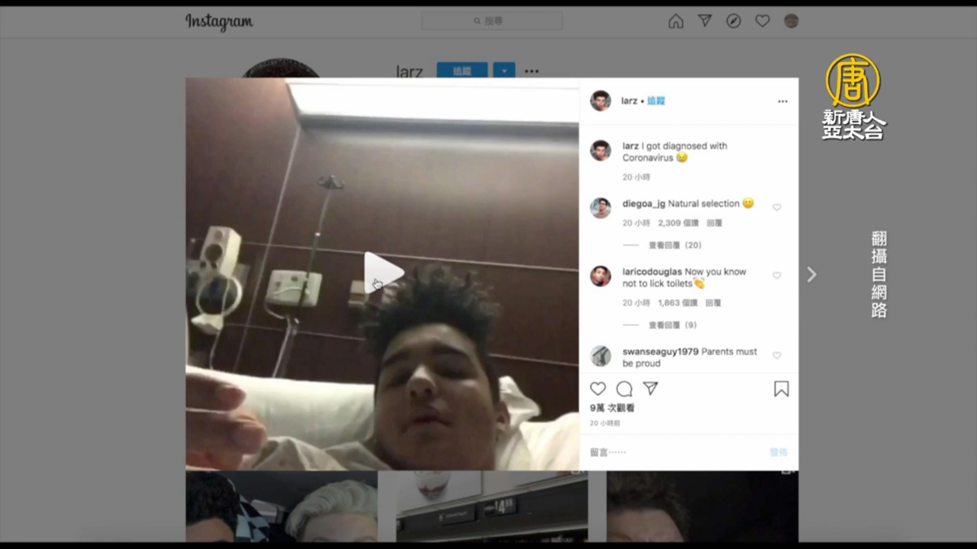 美國加州一名21歲的網紅Larz,在社交媒體上發佈挑戰感染「中共肺炎」的視頻,8秒內舔廁所3次。