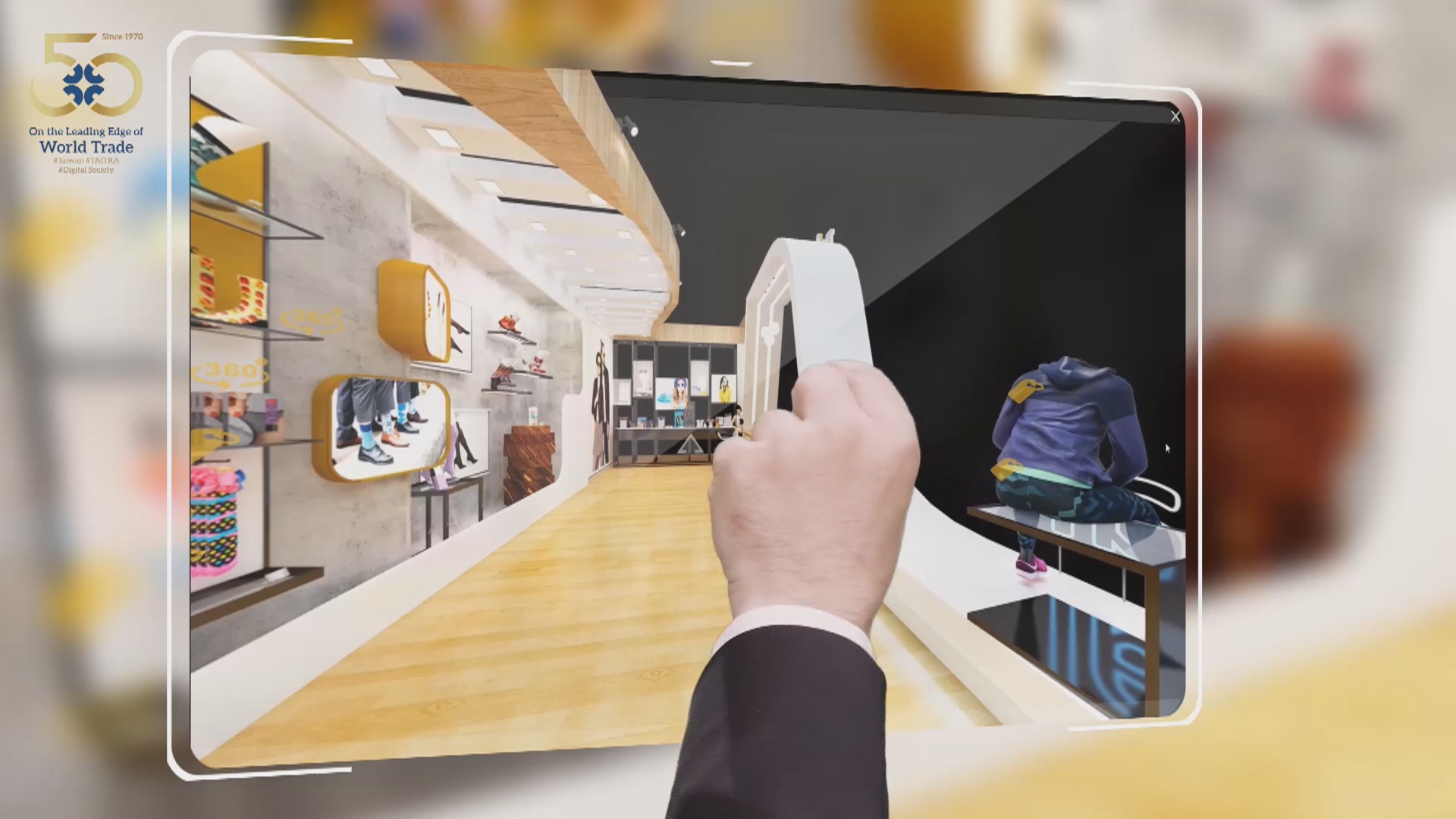 示範人員:「買主進來這個展館之後,他可以做很多商品的瀏覽,像是襪子或眼鏡。」
