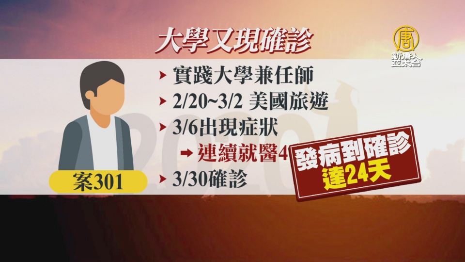 案301是名兼任老師,2月20日到3月2日赴美旅遊,回台後3月6日出現症狀,連續就醫四次,直到30日才確診,中間長達24天,還曾到校上過8次課。
