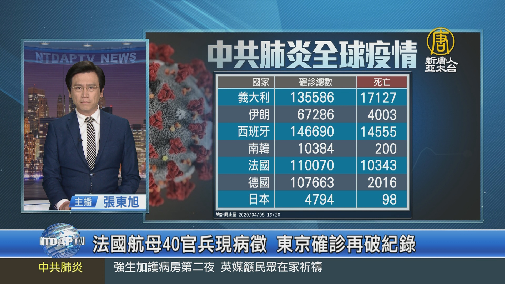 【新唐人亞太台 2020 年 04 月 08 日訊】再來看到,中共肺炎在部分國家的災況:義大利新增確診3千039例,創下3月13日以來新低,累計確診13萬多例,死亡1萬7千多人。法國確診達11萬多例,死亡1萬03百43人,而法國唯一的航空母艦「戴高樂號」,也有40位船上官兵出現病徵,將提前返回南法土倫的母港。被國際質疑嚴重低報的伊朗官方公布,確診達6萬7千286人,死亡數破4千大關。日本累積確診達4千794人、98人死亡,另外,東京今天新增144例確診,再創單日新高紀錄,目前東京都內已有1339人染疫,約佔日本總確診人數的1/4。