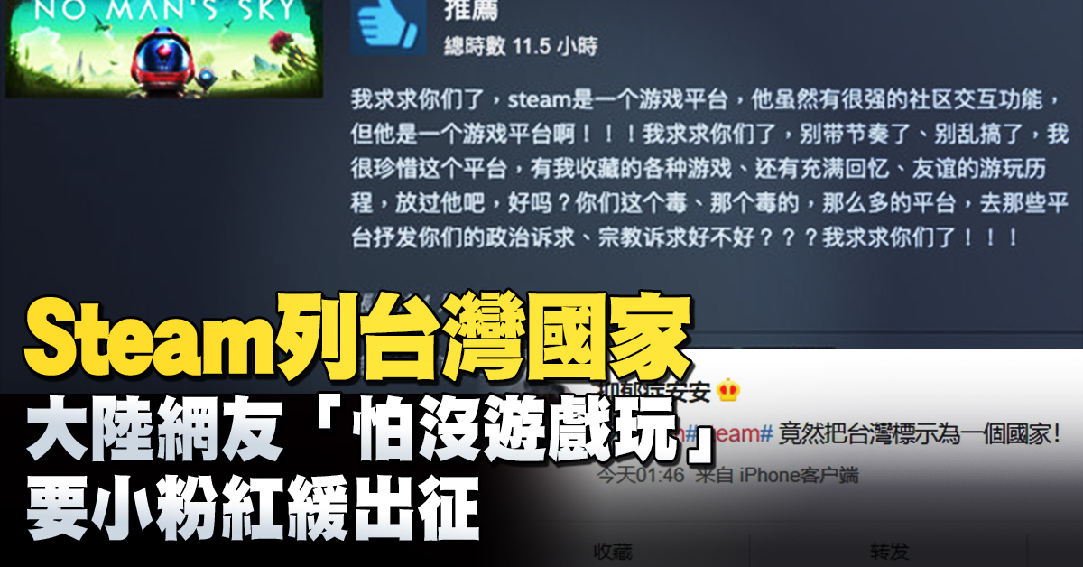 遊戲平台steam將台灣標示為國家雖不是新鮮事,但近期卻引發了中國遊戲社群的大騷動,「小粉紅」及「中國玩家」在各大論壇激烈論戰,不少粉紅在搖旗吶喊表示要出征時,卻遭「自家人」強烈反彈,被不少其他用戶求情、制止及吐槽。
