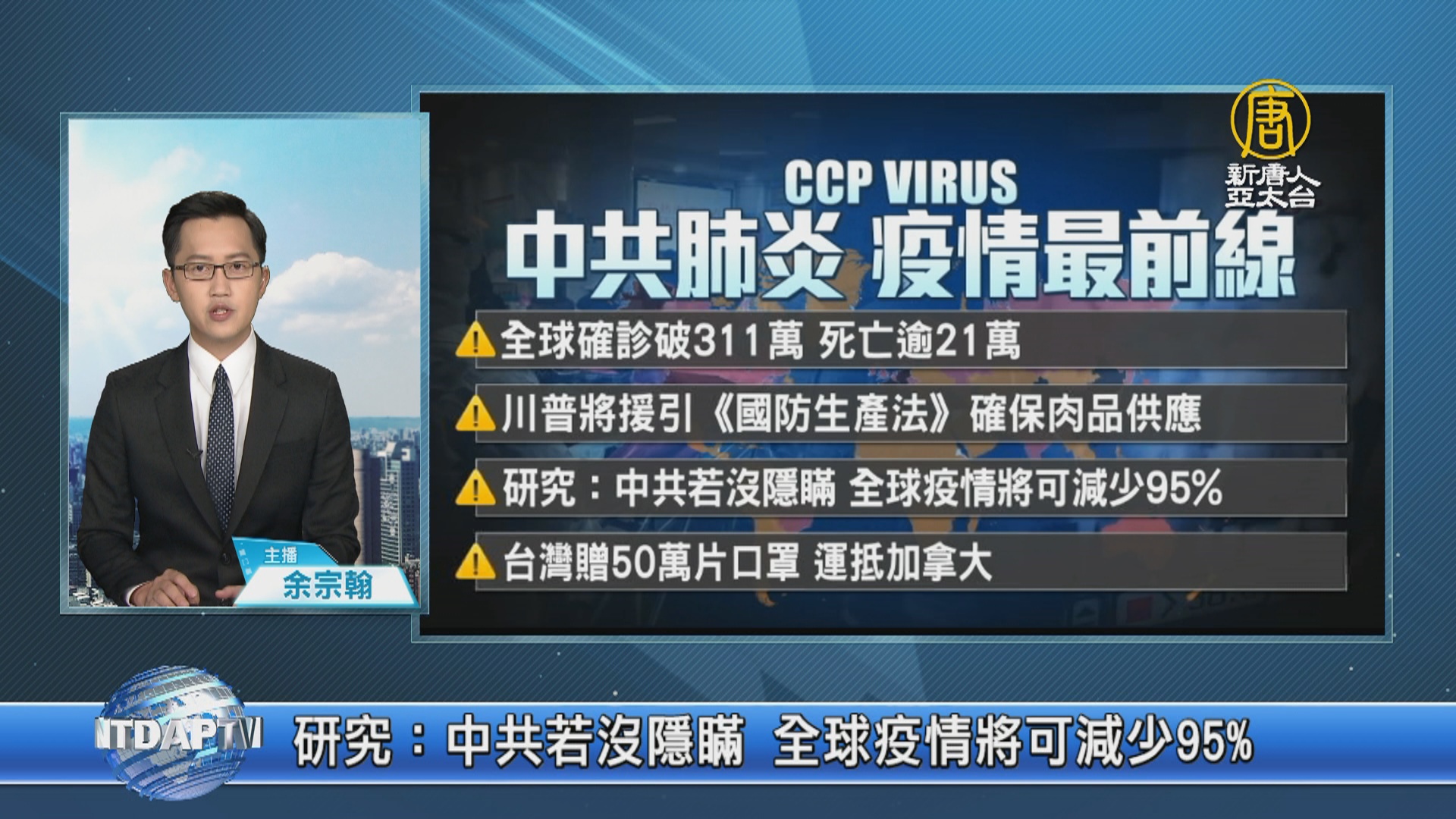 【新唐人亞太台 2020 年 04 月 29 日訊】早安新唐人,先帶您關心,中共肺炎今天在全球的追蹤焦點。全球確診破311萬人,死亡超過21萬。美國總統川普將援引《國防生產法》,確保肉品供應。研究指出:中共如果沒有隱瞞,全球疫情將可減少95%。台灣贈50萬片口罩,運抵加拿大。