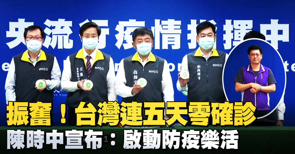 【新唐人亞太台 2020 年 04 月 30 日訊】台灣已連續5天無新增確診病例、18天無本土病例,中央流行疫情指揮中心指揮官陳時中今(30)日表示,現在社區傳播可能性已降到最低,鼓勵民眾力行「防疫新生活運動」,養成良好的生活習慣,落實防疫之餘,也能放鬆享受生活,保有防疫樂活新態度!