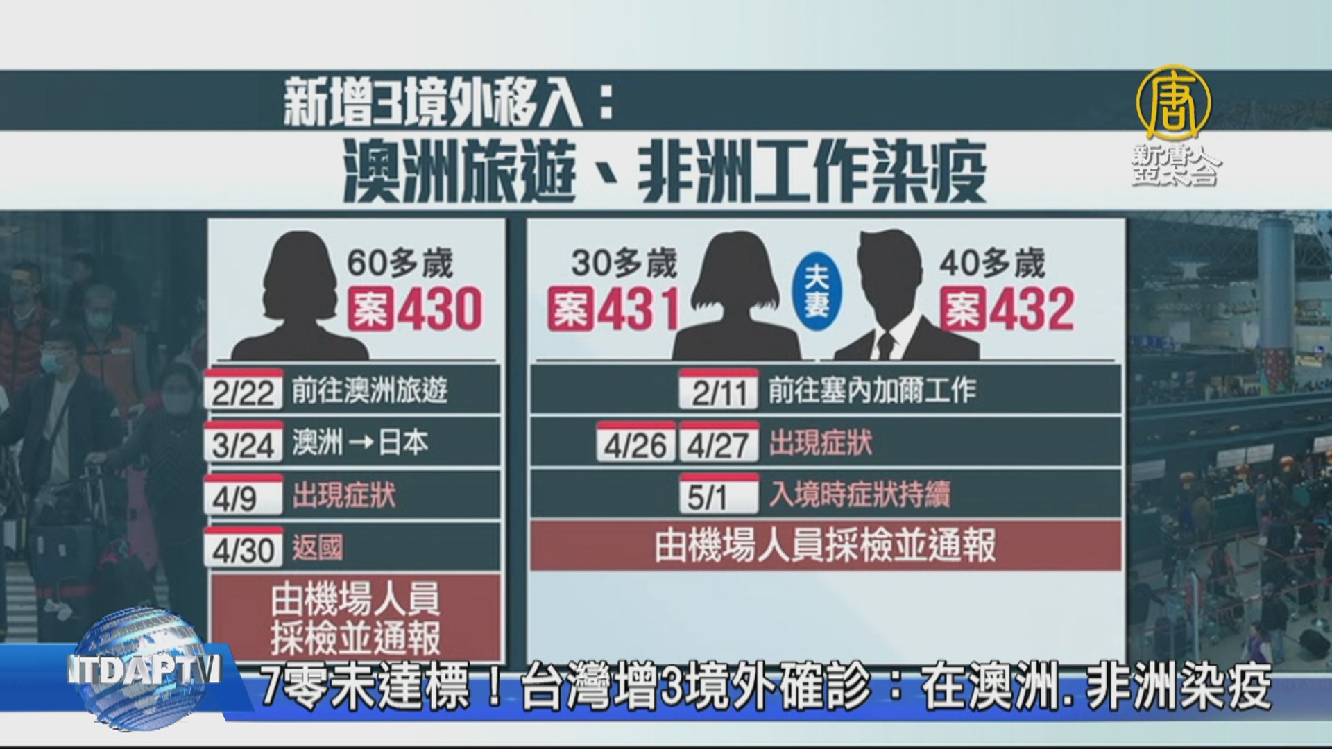 案430在2/22日前往澳洲旅遊,3/24日再從澳洲前往日本,4/9日出現症狀,30日返國時由機場人員採檢並通報,而案431及432夫妻,2/11日前往塞內加爾工作,4月26、27日出現症狀,5/1日入境時症狀持續,一樣也是由機場人員採檢通報。指揮官陳時中坦言,雖然七天零確診目標無法達成,有點失望,但只要個人防護做好,產生的風險就去面對它接受它。