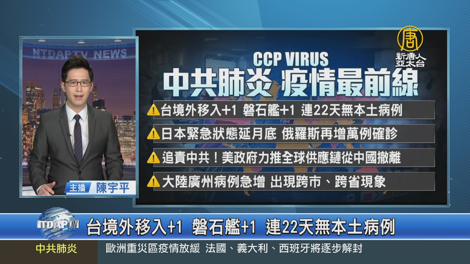 【新唐人亞太台 2020 年 05 月 04 日訊】中共肺炎疫情持續肆虐全球190國,全球確診突破352萬!帶您瀏覽疫情重點,台灣今天新增1例境外移入,磐石艦也新增1人確診。目前已經連續22天沒有本土病例。日本宣布全國緊急狀態延至5月底,俄羅斯疫情失控!連2天新增確診突破萬人。傳出美國川普政府正「加速推進」將美國工業供應鏈遷出中國計畫,並考慮用加徵新的關稅,制裁中共。大陸廣州近日發現多起病例,跡象顯示已發生群聚感染,且出現「跨市和跨省」擴散的現象。