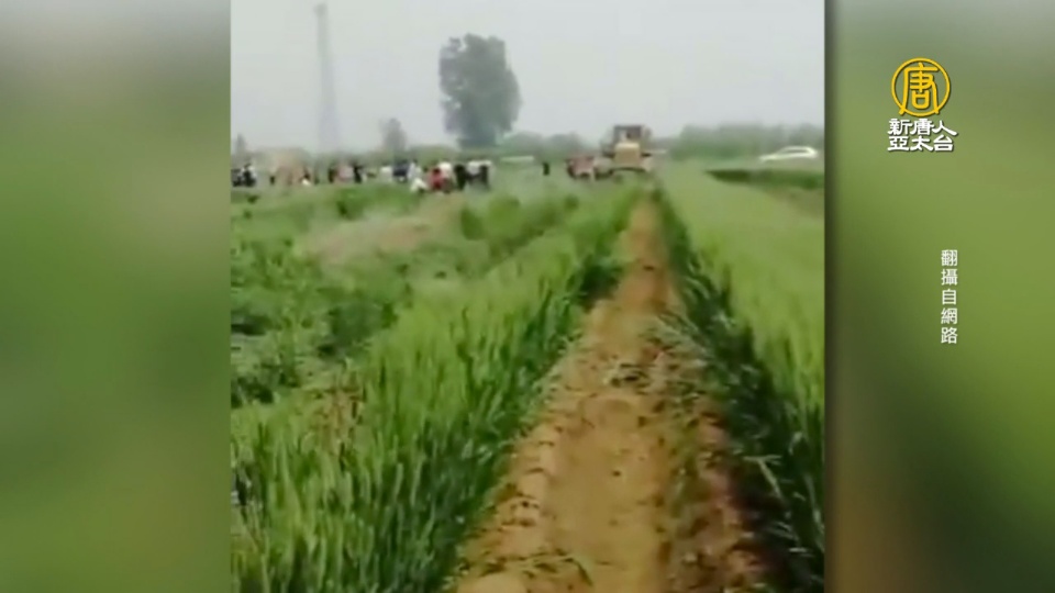 發視頻的推友說,躲過了旱災、蟲災,快要收割的麥田卻要被鏟掉,一家幾口躺在巨大的鏟車前拚死抵抗。