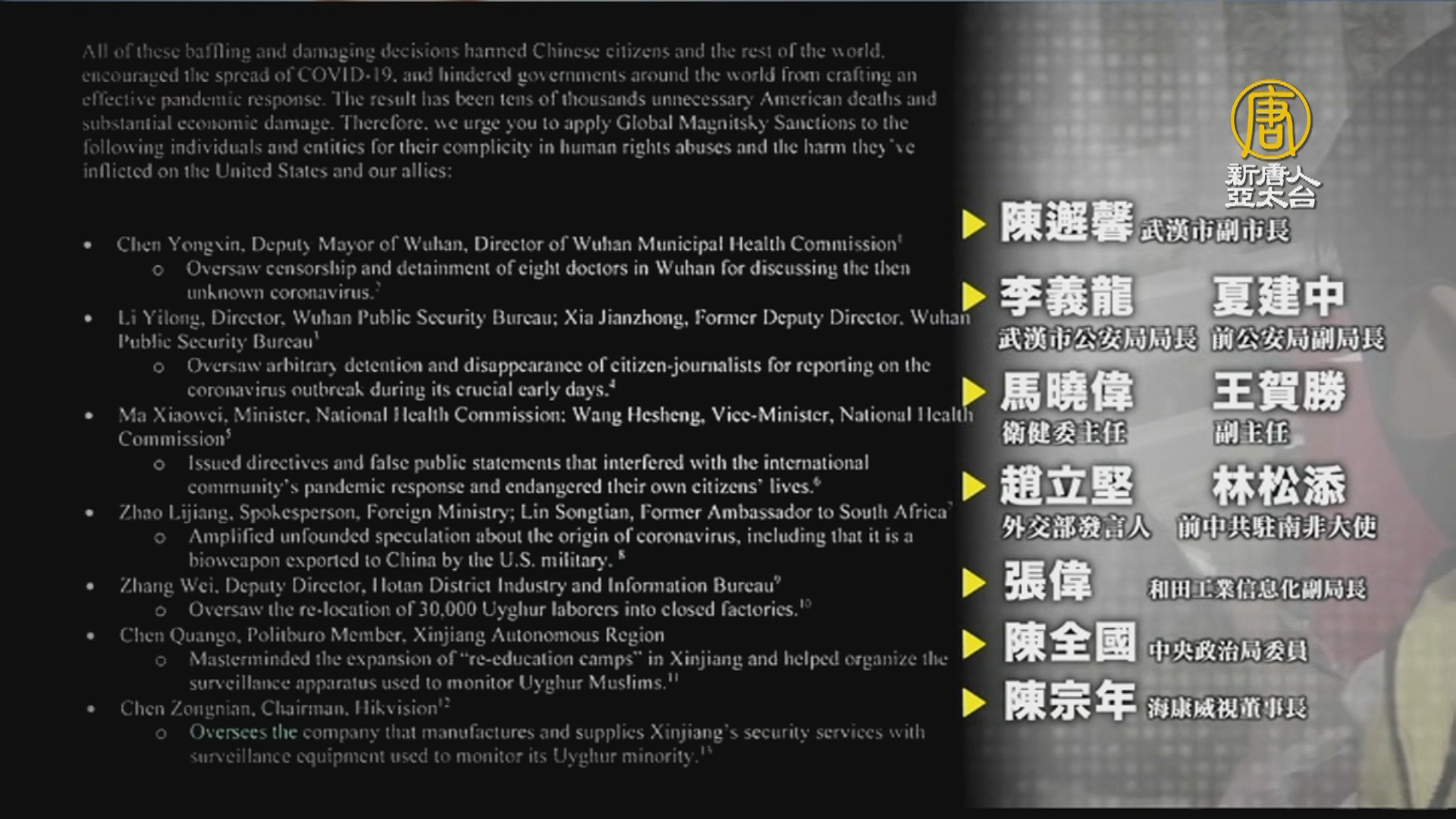【新唐人亞太台 2020 年 05 月 20 日訊】美國三位聯邦眾議員,週一,致信國務卿蓬佩奧,以及財政部長梅努欽,敦促動用《全球馬格尼茨基人權問責法》,制裁包括中共外交部發言人趙立堅、武漢市公安局長李義龍,等十名中共官員。