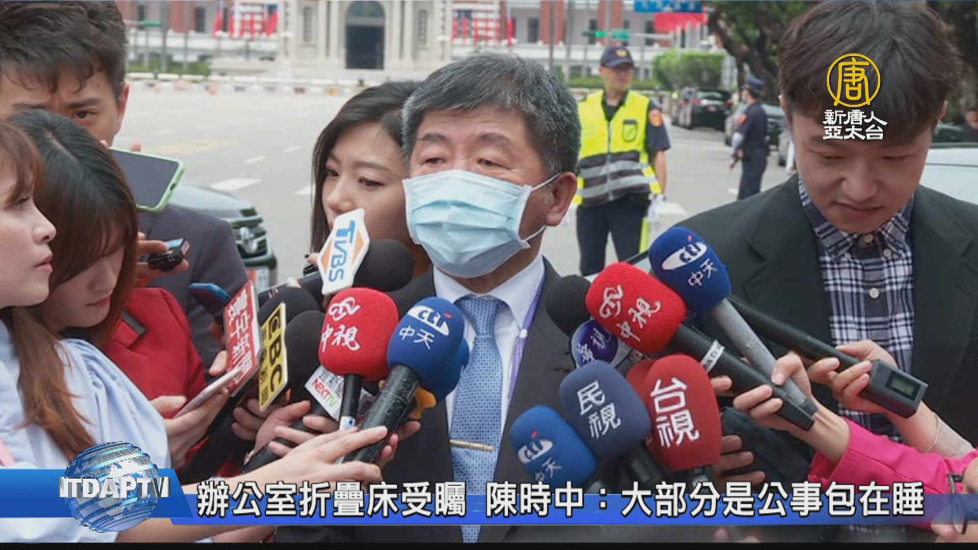 【新唐人亞太台 2020 年 05 月 20 日訊】衛福部長陳時中上午與防疫國家隊一同出席520就職演說,會後陳時中受訪時說,對於總統肯定防疫,他認為防疫成功是全體人民配合,台灣防疫能走到今天,陳時中非常感動,也感謝總統肯定。而媒體關注前一天,陳時中辦公室裡的出現折疊床,陳時中說疫情趨緩時,床都是公事包在睡。