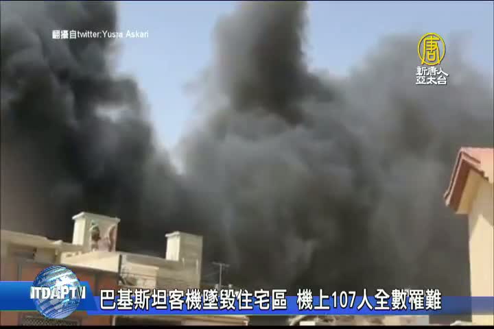 【新唐人亞太台 2020 年 05 月 22 日訊】新聞一開始,先帶您關心國際消息,巴基斯坦一架客機在當地住宅區墜毀,巴基斯坦航空當局表示,機上搭載將近百名乘客與8名機組人員政府官員表示,至少有一名乘客奇蹟生還。該國衛生官員也宣布,因應飛機失事,喀拉蚩當地的所有醫院都進入緊急狀態。而這也是該航空公司,在4年內的第2起空難事故。