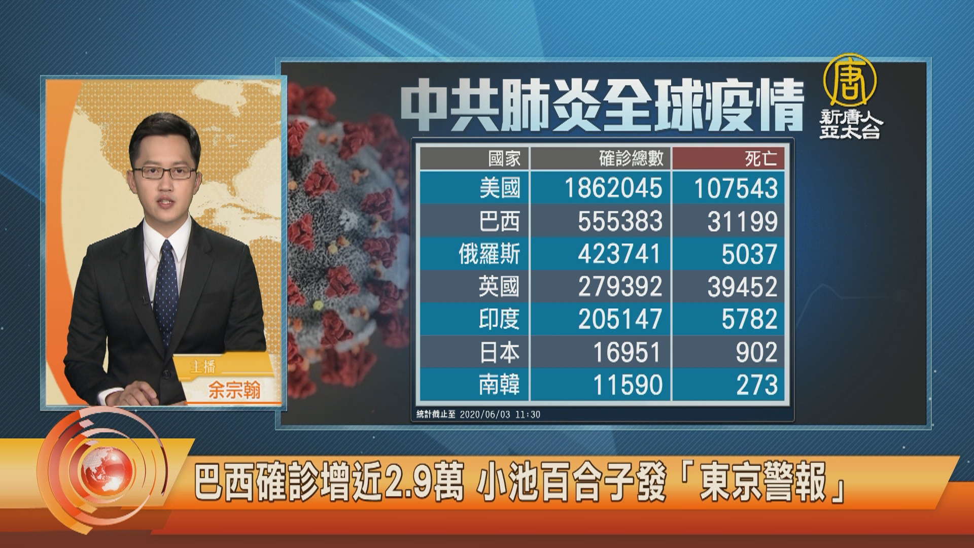 【新唐人亞太台 2020 年 06 月 03 日訊】來看到,中共肺炎最新動態,全球累計超過634萬人確診、死亡37萬8千多人,美國確診達到186萬2千多例、超過10萬7千5百人死亡,巴西單日新增將近2萬9千起確診,累計達55萬5千3百多例,死亡人數超過3萬1千人,印度確診突破20萬5千多例、超過5千7百人死亡。南韓新增49起確診,其中48例出現在首都圈地區。日本東京2日新增34起確診、一週內新增114例,東京都知事小池百合子,首次發布「東京警報」。而在全球疫情中,中共、伊朗、北韓等國家,被認為嚴重低報數據。