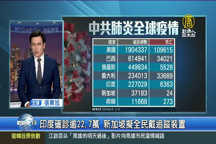 【新唐人亞太台 2020 年 06 月 05 日訊】來看到,中共肺炎最新動態,全球累計超過661萬例確診、 38萬9千多人死亡,美國確診超過190萬4千3百例、死亡10萬9千6百多人。中南美洲成為現在疫情重災區,其中巴西確診將近61萬5千例,全球第二多、死亡3萬4千多人。印度新增近萬例確診,累計超過22萬7千例、國防部次長庫瑪確診染疫。南韓再增39人確診,首都圈地區群聚性感染事例接連不斷,最近兩週的確診病例中群聚感染病例達385例。新加坡累計3萬7千1百多例確診,新加坡官員表示,正在研發可穿戴裝置,等研發成功後,將發給全國570萬人,做為追蹤疫情發展的利器。而在全球疫情中,中共、伊朗、北韓等國家,被認為嚴重低報數據。