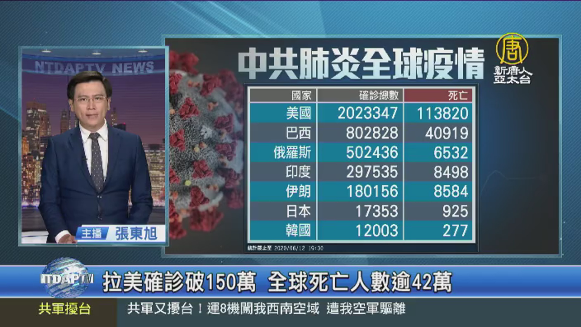 【新唐人亞太台 2020 年 06 月 12 日訊】帶您看到,中共肺炎最新動態,目前全球累計超過751萬人確診、42萬人死亡。美國確診超過202萬例、死亡11萬3千多人。拉丁美洲累計超過150萬人染疫,超過7萬人死亡,其中疫情最嚴重的巴西確診超過80萬2千8百多人、死亡人數突破4萬人、高居全球第3。印度單日再增1萬9百多例確診,連日來創新高,達到29萬7千5百多例、死亡將近8千5百人。日本東京昨天才正式宣布解除「東京警報」,並解除及放寬停業要求。今天又新增25起確診,連續2天超過20例,累計確診達5千4百多人。南韓最近每天新增確診病例都在兩位數以上,累計超過1萬2千例,將無限期延長強化預防和衛生準則,直到每日新增病例降至個位數為止。另外,在全球疫情中,中共、伊朗、北韓等國家,被認為嚴重低報數據。