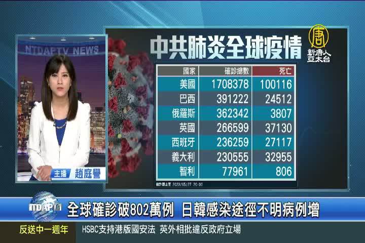 【新唐人亞太台 2020 年 06 月 16 日訊】帶您看到,中共肺炎最新動態,目前全球累計超過802萬人確診、死亡43萬人,不過,中共、伊朗等國家,被認為嚴重低報數據。其中超過一半確診在美國和歐洲,而拉丁美洲感染數則直線飆升,總確診數占整體的21%。美國確診超過211萬4千例,死亡人數11萬6千多人。巴西確診超過88萬8千人、死亡4萬3千9百多人。南韓確診再增34例,首都圈關聯性病例層出不窮,本月以來感染途徑不明的病例佔比超過10%。日本東京11日第三階段解封後,連6天新增超過20例確診,今天新增病例中有16名感染途徑不名。