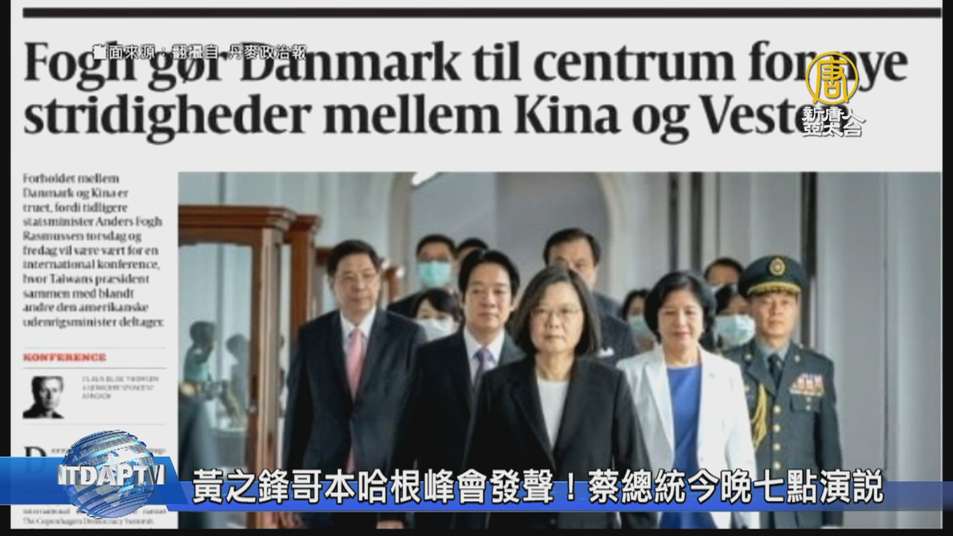 【新唐人亞太台 2020 年 06 月 19 日訊】由前北約秘書長拉斯穆森 主辦的哥本哈根民主高峰會,昨天第一天,邀請香港眾志秘書長黃之鋒擔任主講人,今晚,總統蔡英文也將以視訊方式,受邀演講。美國國務卿蓬佩奧,後續也會以視訊方式演講。