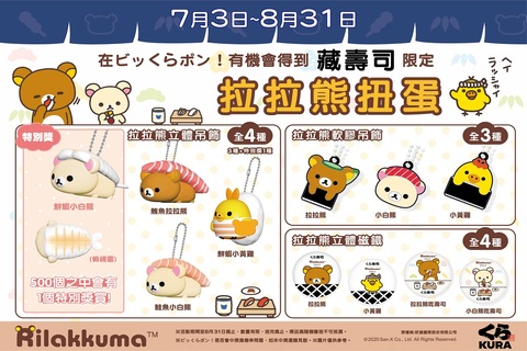 拉拉熊與它的夥伴們即將化身成藏壽司經典產品:「拉拉熊-立體吊飾」有偽裝成鮭魚壽司的「鮭魚-小白熊」、跟鮮蝦合為一體的「鮮蝦-小黃雞」。另外「拉拉熊-軟膠吊飾」則有頭上蓋著小黃瓜的「鐵火捲-拉拉熊」!其中「拉拉熊-立體磁鐵」系列,更有以特別賞形式現身的「鮮蝦-小白熊」,等待藏友們一起來挑戰!可愛又迷人的「藏壽司專屬拉拉熊-限定扭蛋」,將於7月3日至8月31日限期出沒,只要利用藏壽司「餐盤回收扭蛋抽獎系統」,就有機會獲得獨一無二的小驚喜。