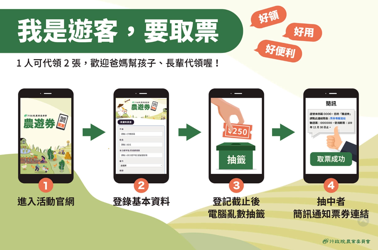 農委會輔導處指出,民眾需到農業易遊網網站填寫身分證字號、手機號碼和居住地縣市申請,接著會取得電子票券的QR Code,為了便利老人或小孩等無智慧型手機的民眾,一隻手機可以代領2人取票,每人限申請領取並使用票券1次,不可重複領取,票券效期為60天,逾期將失效。