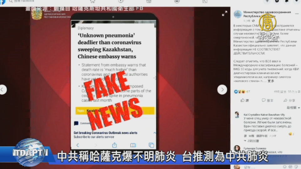 中共駐哈薩克使館發佈消息稱,哈薩克今年上半年,不明肺炎致死率高於中共肺炎。消息一出,香港《南華早報》也跟進報導,指哈薩克今年上半年已有1772人因此死亡。不過,哈薩克衛生部門,在台灣時間10日上午於臉書發文,駁斥《南華早報》的報導是假新聞。對於哈薩克疫情,台灣疫情指揮中心認為,應該和中共肺炎(武漢肺炎)有關。