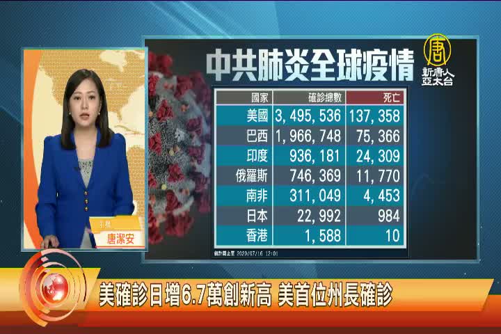 【新唐人亞太台 2020 年 07 月 16 日訊】關心中共肺炎動態,目前全球公開數據,累計確診超過1千3百47萬人,死亡58萬1千人。但中共、伊朗等國家,被認為嚴重低報數據。美國新增6萬7千多例確診,再創日增病例數新高,累計超過349萬5千例。奧克拉荷馬州長 史提特 宣布確診。巴西總統波索納洛進行第2次篩檢,結果仍然是陽性。巴西新增確診將近4萬例。