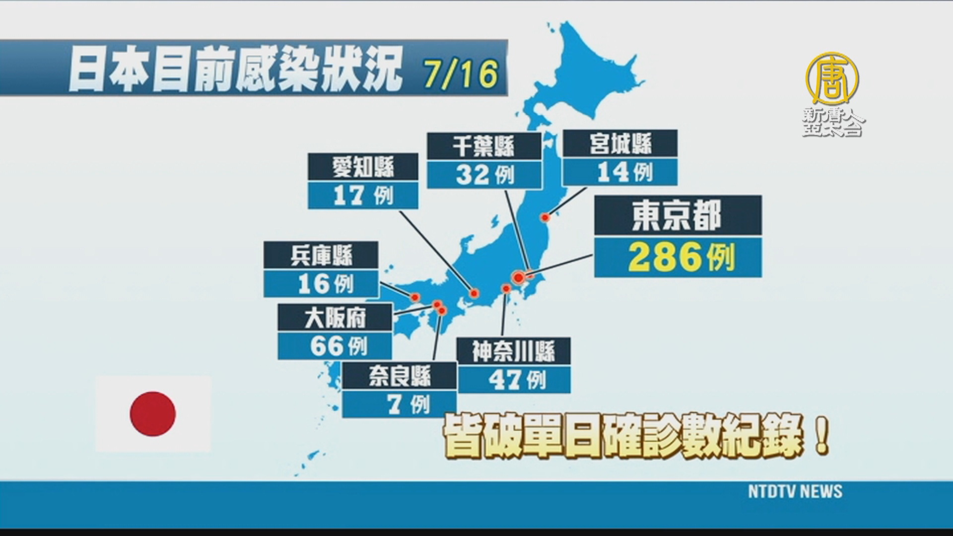 【新唐人亞太台 2020 年 07 月 16 日訊】日本中共肺炎疫情持續升溫,今天(16日)東京再度確診286例,創下疫情爆發以來最高單日確診數,且不止東京,各地也紛紛破紀錄,截至下午6點,日本今日總確診數已經突破500例。連2天刷新解封後單日最高紀錄。