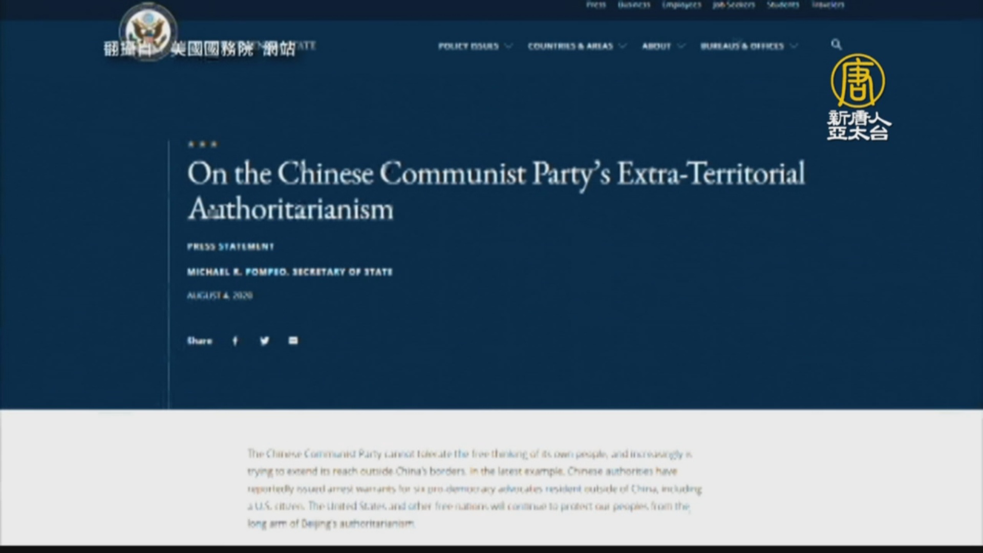 【新唐人亞太台 2020 年 08 月 05 日訊】歡迎回來,香港政府以《港版國安法》對6名海外港人發佈通緝,包括美國公民朱牧民。美國國務卿蓬佩奧,周二(5日)聲明指出,中共容不下人民的自由思想,企圖將影響力擴展到境外。美國和其他自由國家,將繼續保護自己的人民,讓他們不受中共威權主義長臂管轄的威脅。
