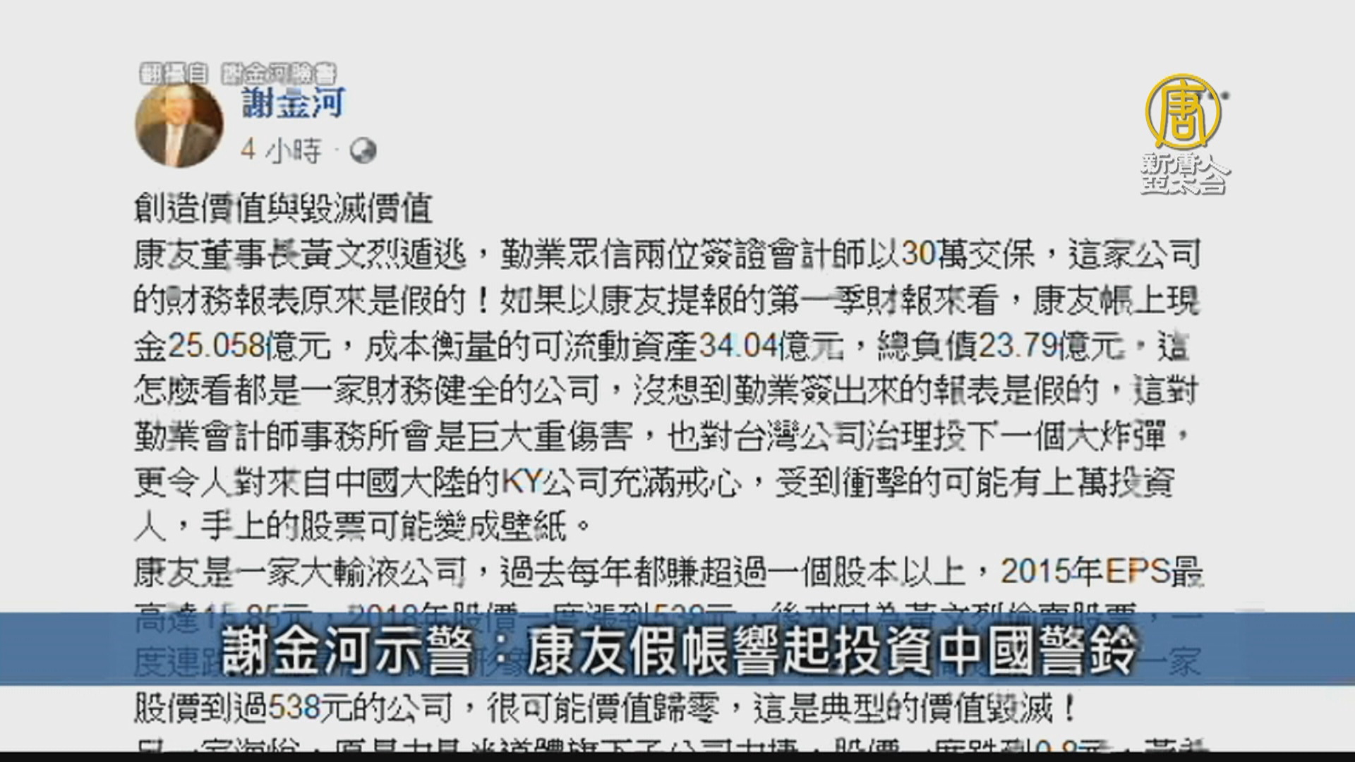 康友董事長黃文烈失蹤遭檢調拘提,公司股價從最高538元失速下跌,財信傳媒董事長謝金河以「創造價值與毀滅價值」分析康友案,驚呼「沒想到勤業簽出來的報表是假的」,示警康友假帳直接響起投資中國警鈴。他認為,康友案將令人對來自中國大陸的KY公司充滿戒心,受到衝擊的可能有上萬投資人,手上的股票可能變成壁紙。