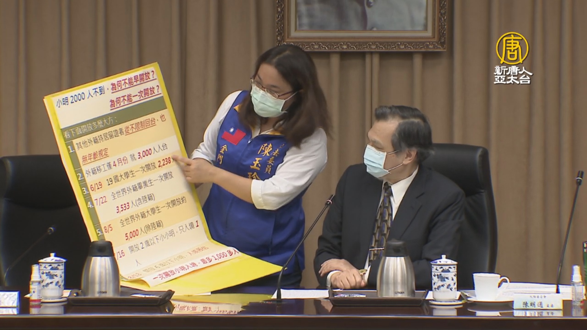 國民黨立委 陳玉珍:「(上次說)兩個禮拜後,政府還沒有規劃出一定時程那我兩個禮拜後會再來,我是希望政府要有明確規範出來,就是說什麼時候你要開放多少人,什麼時候要開放多少人。」