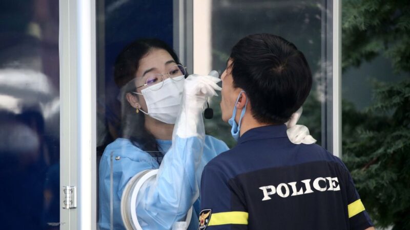 2020年8月19日,南韓醫務人員戴著防護裝備,對警察檢測。(Chung Sung-Jun/Getty Images)